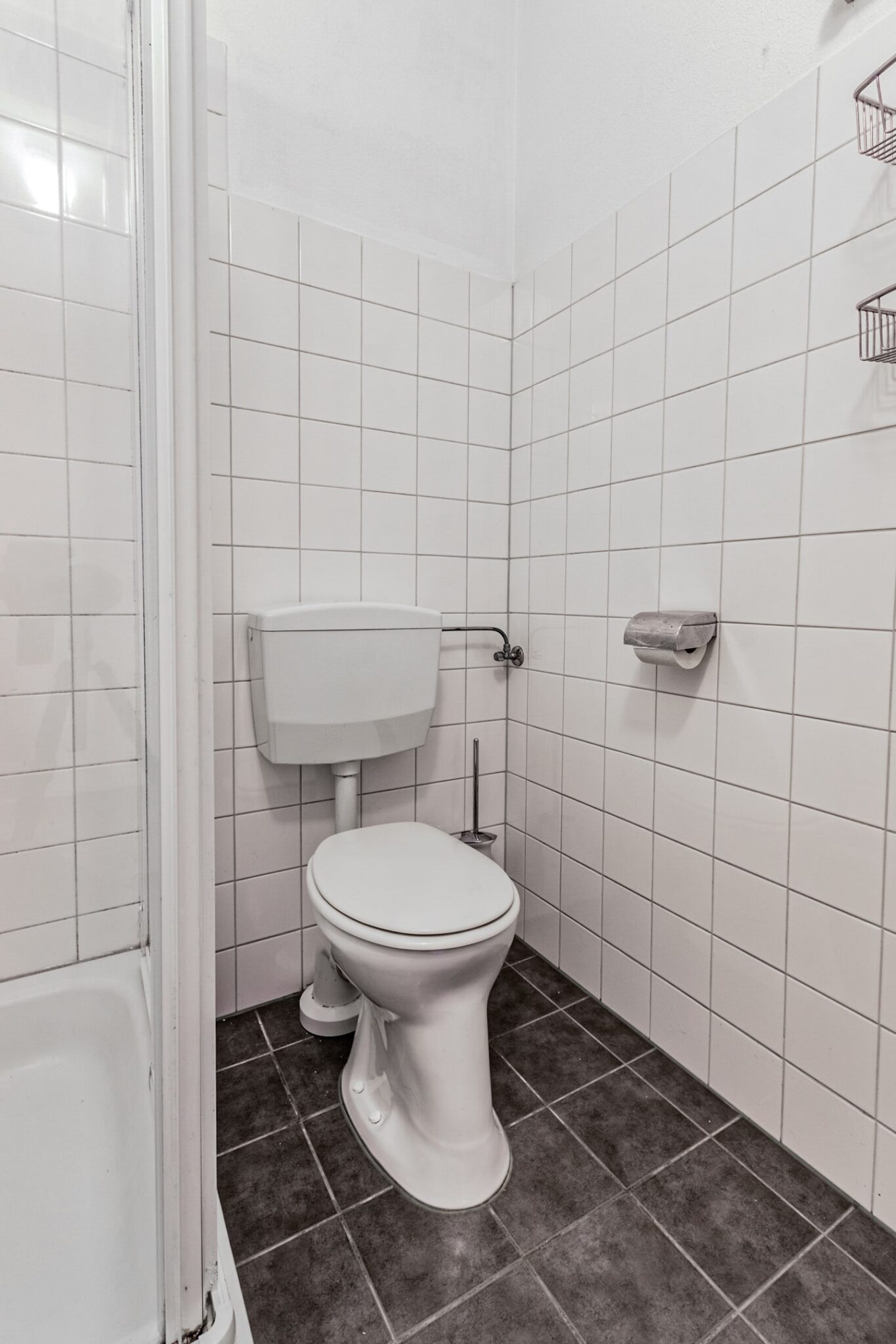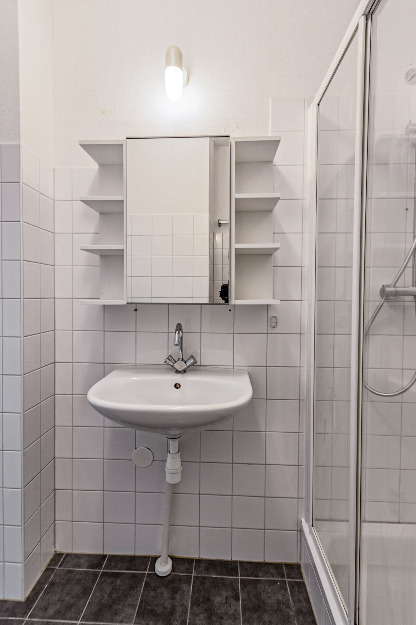 De hal biedt toegang tot alle vertrekken van de woning. Aan de binnenzijde van het complex bevindt zich de slaapkamer, een rustige ruimte voor ontspanning. Aangrenzend bevindt zich de badkamer, welke is uitgerust met een wastafel, toilet en een douchecabine.
