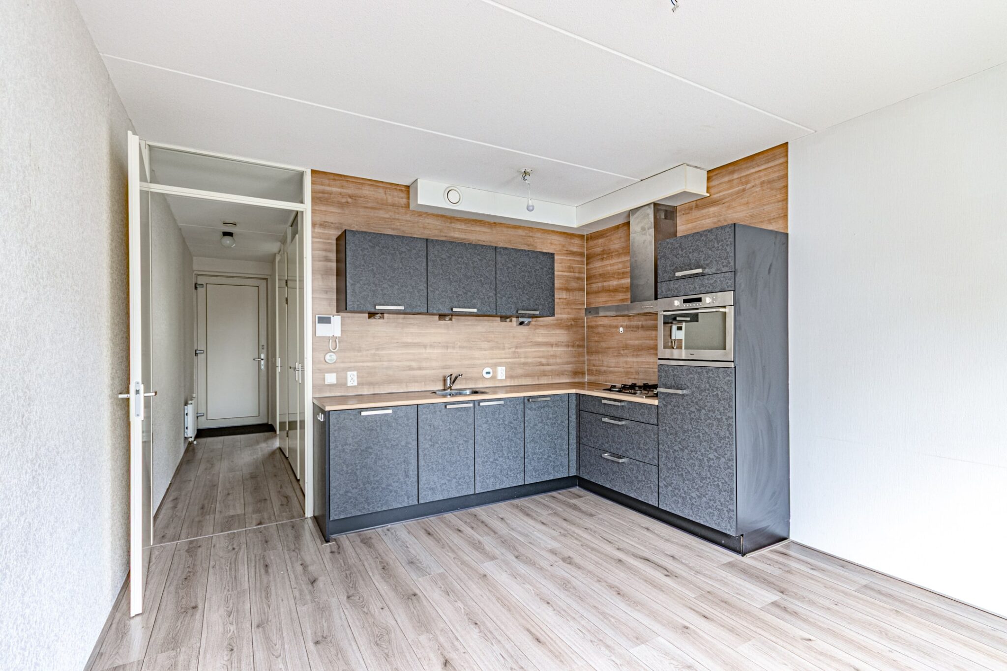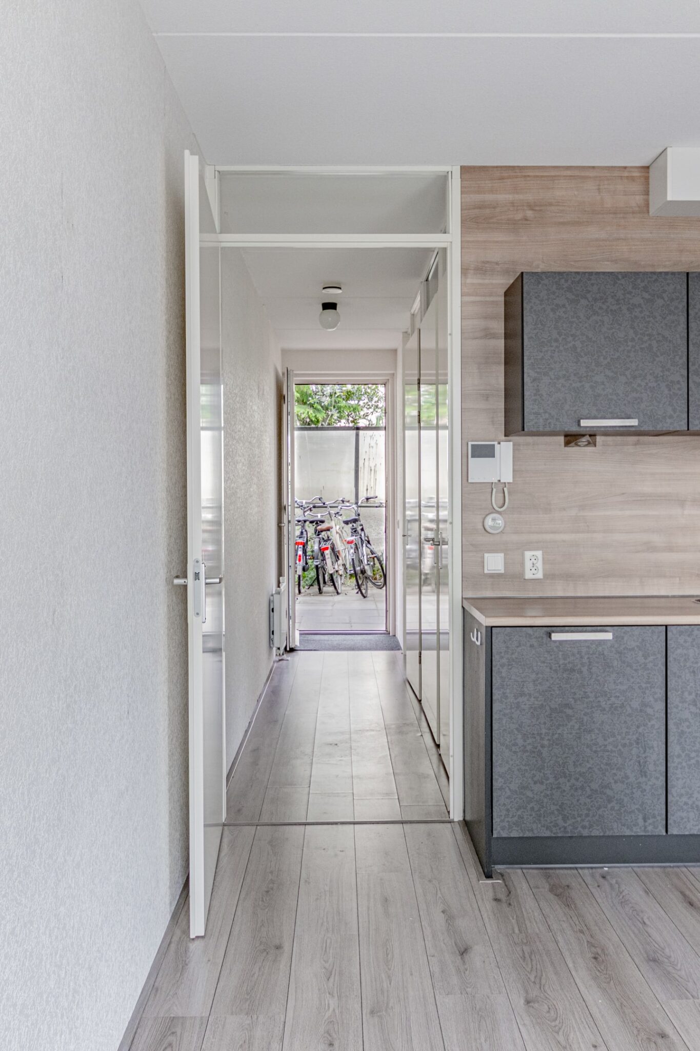 De lichte woonkamer aan de straatzijde van de woning beschikt over een open keuken. De keuken is uitgevoerd met een koelkast, vaatwasser, gaskookplaat, afzuigkap en een combi-magnetron. Ook is er een gezamenlijke fietsenberging om je fiets neer te zetten.