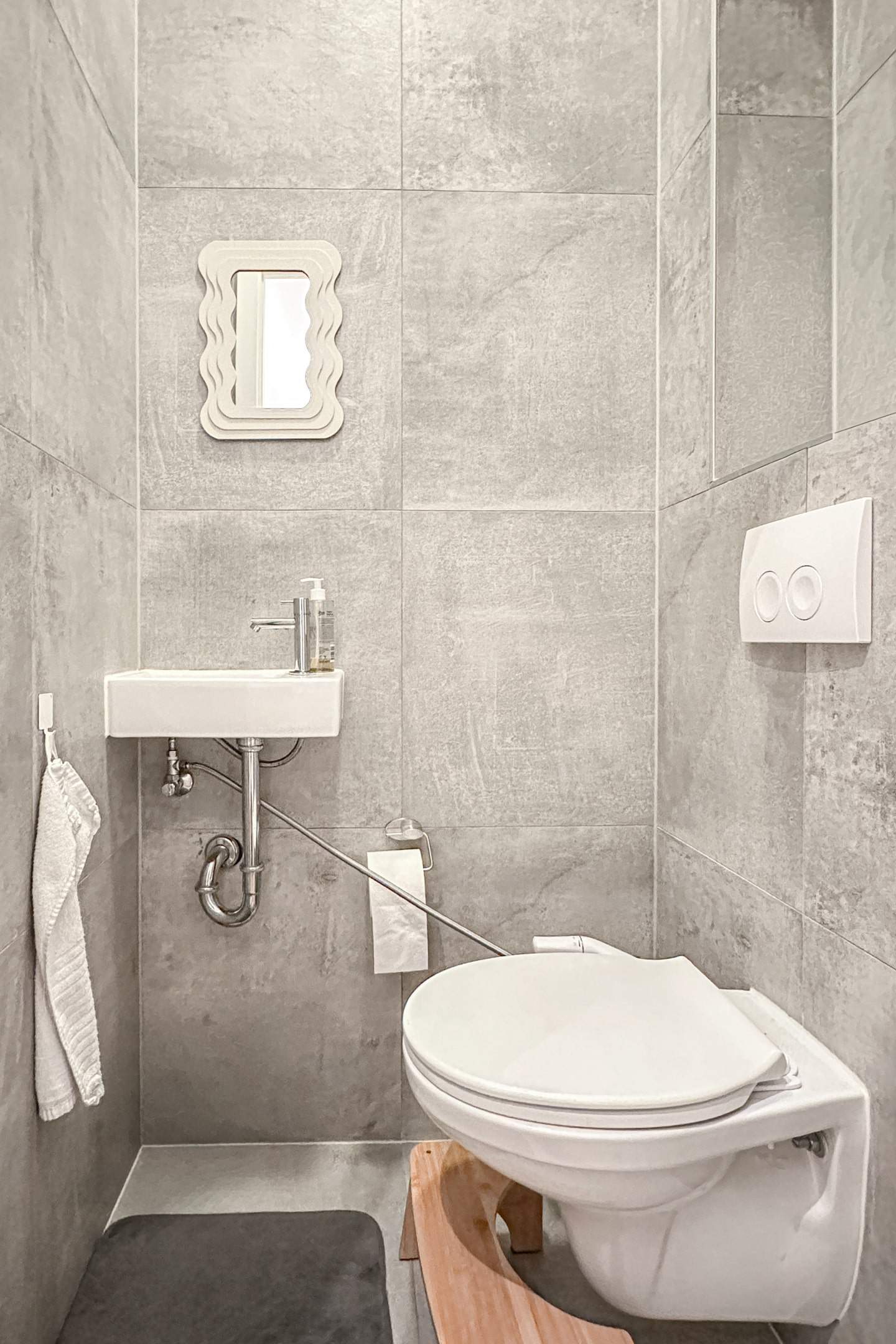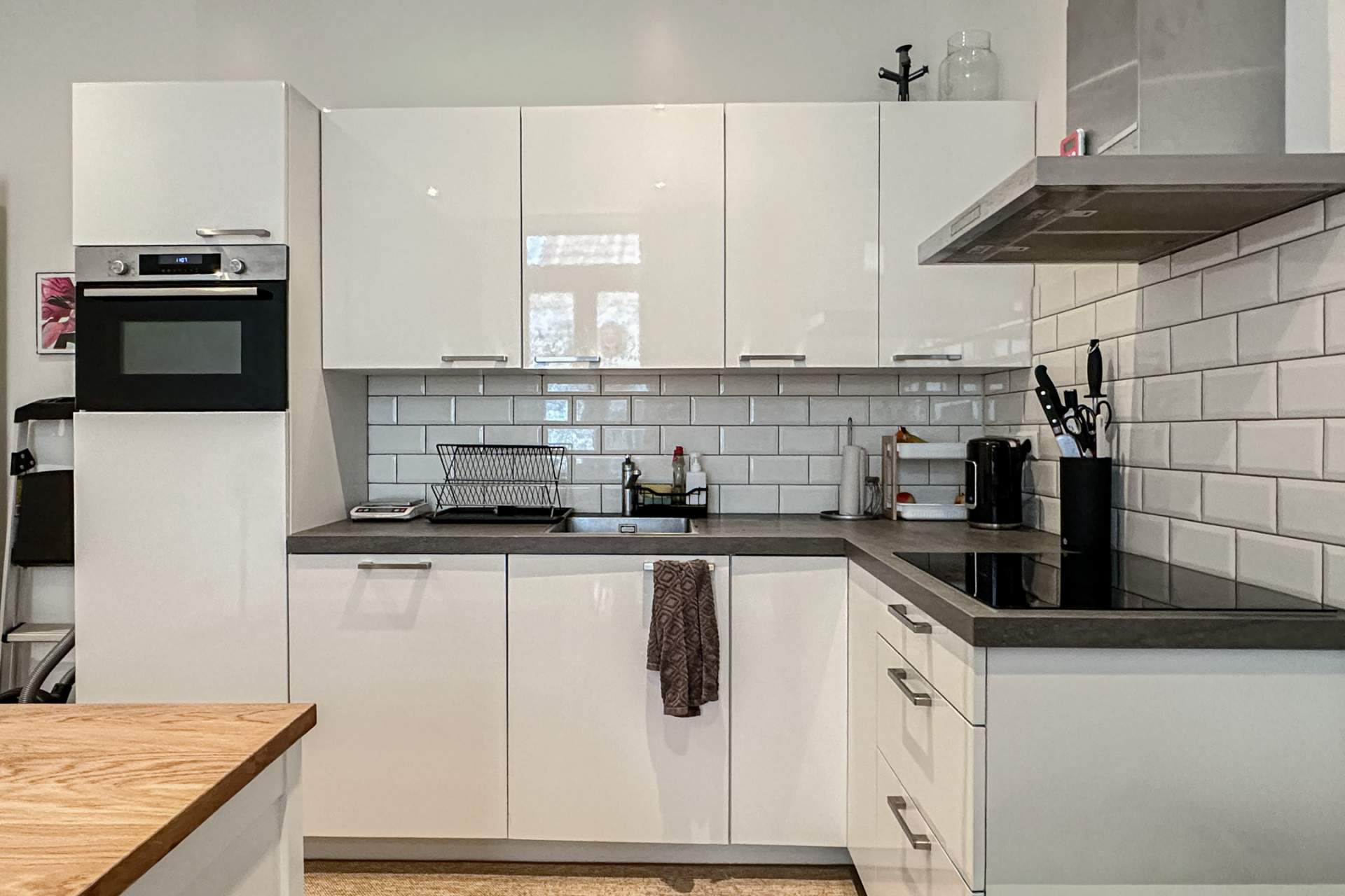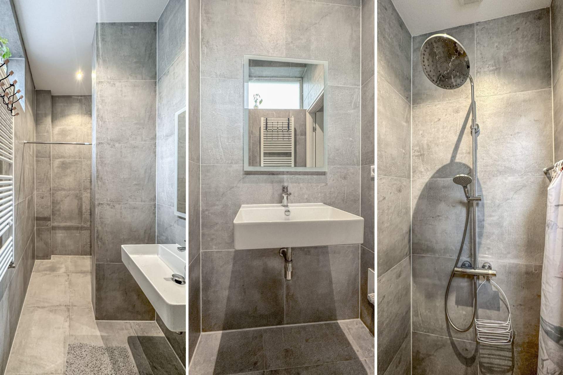 Apartment entrance, spacious street-facing bedroom, luxurious bathroom with walk-in/rain shower, sink, and designer radiator, hallway, separate wall-hung toilet with hand basin, spacious living room with French doors leading to the generous roof terrace, and a new, luxurious open-plan kitchen with integrated appliances: dishwasher, combination oven, microwave, refrigerator, 4-burner cooktop, and extractor hood.