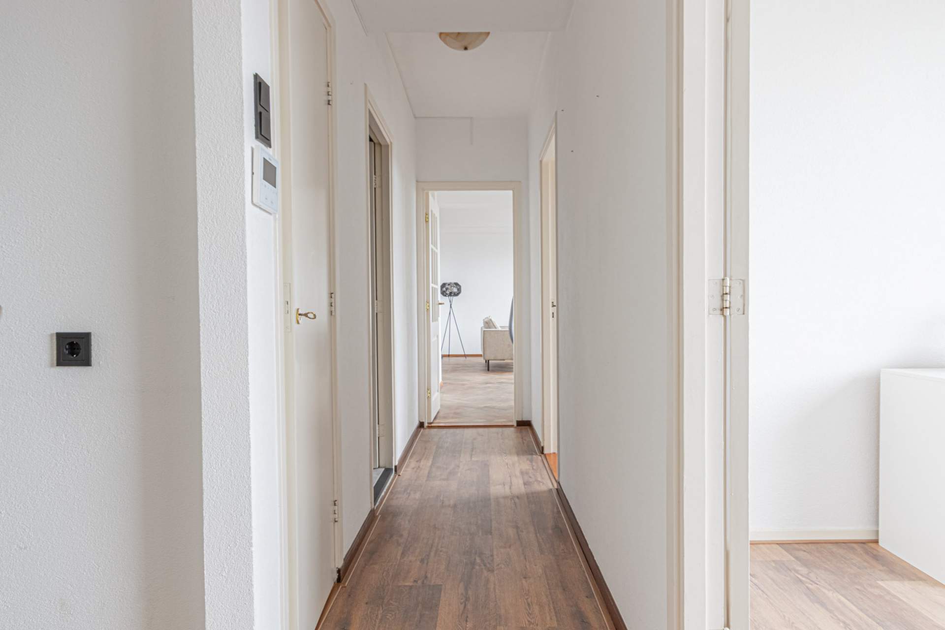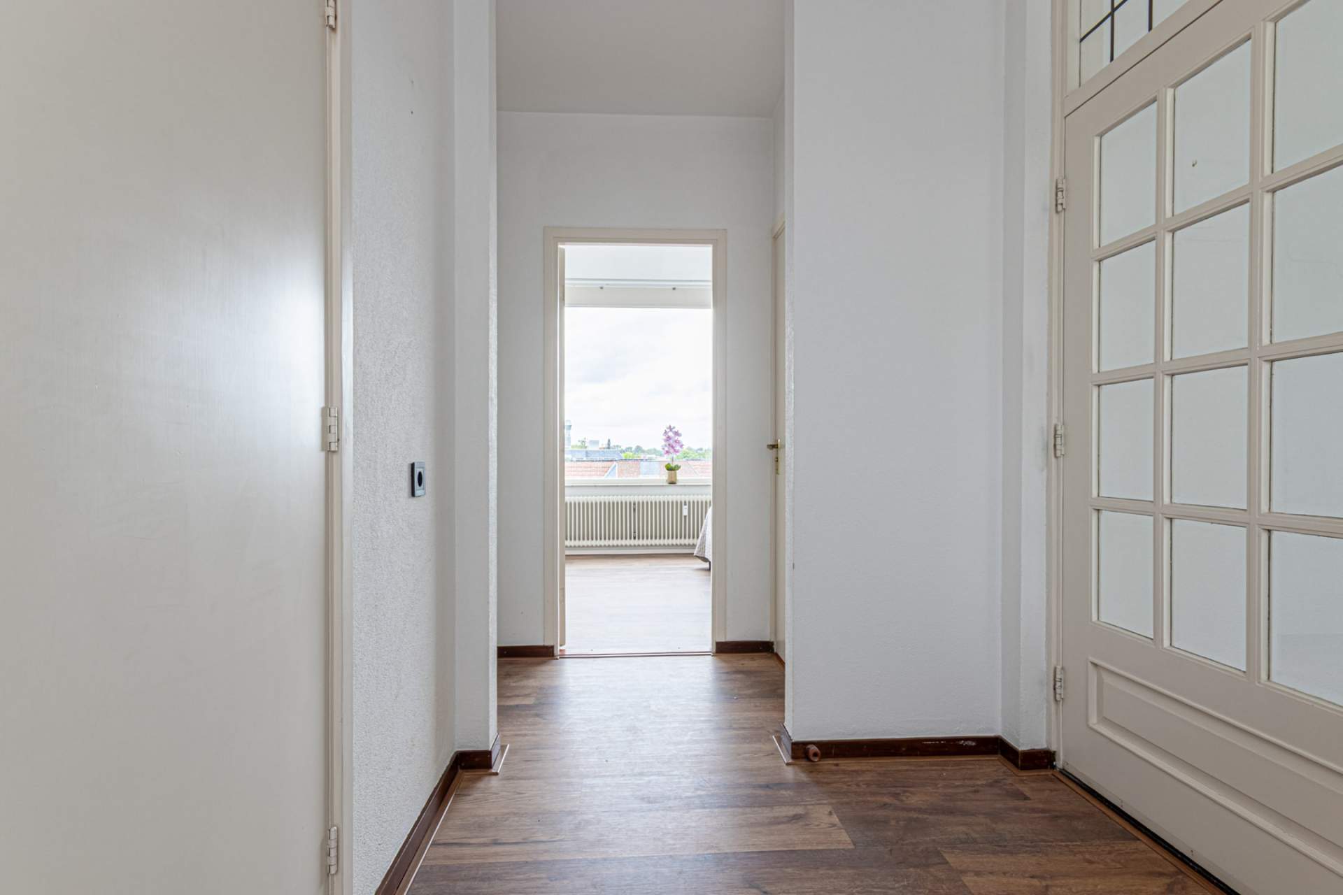 Entree, ruime hal met toegang tot alle vertrekken. Royale, superlichte woonkamer met ramen aan twee kanten én toegang tot twee balkons