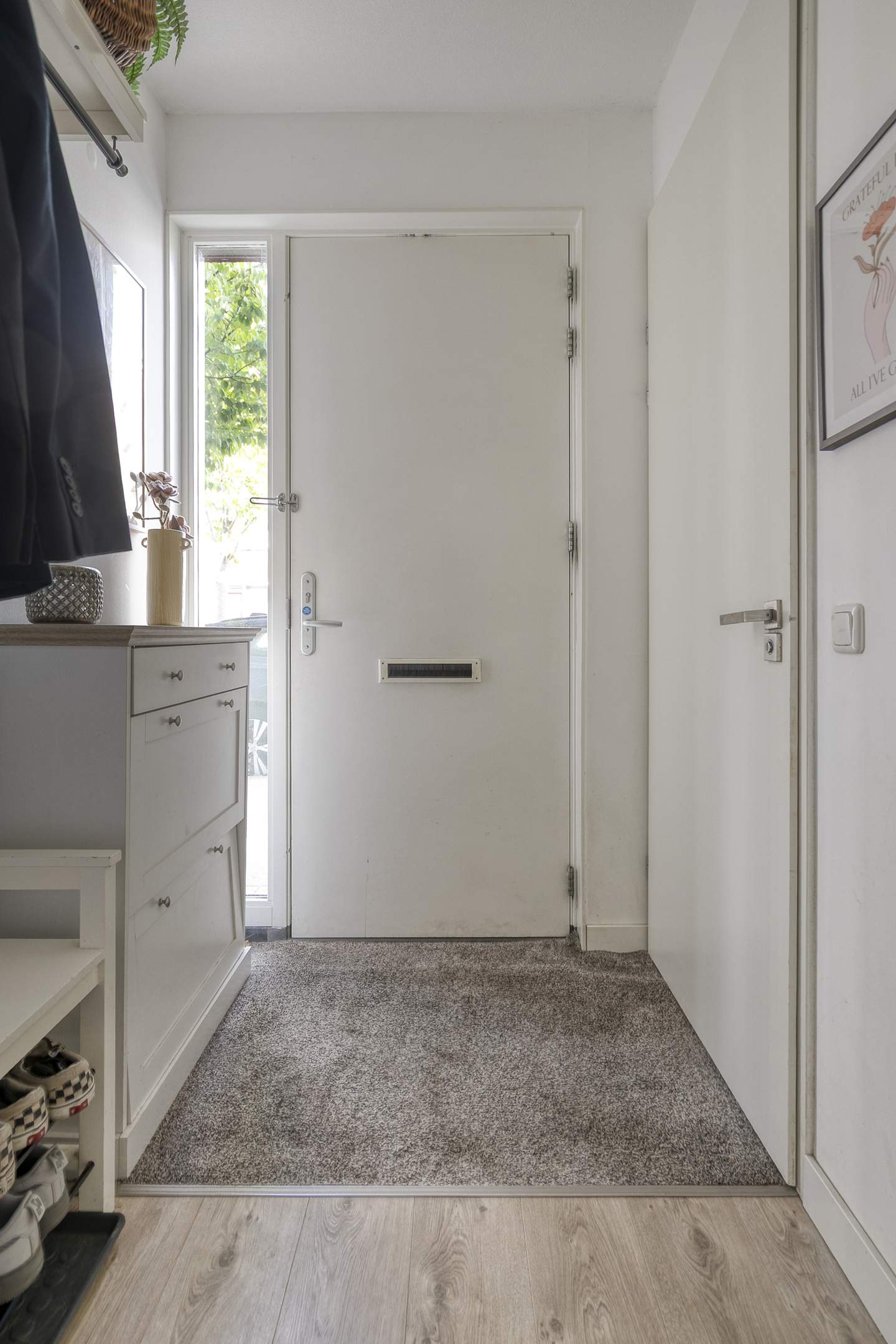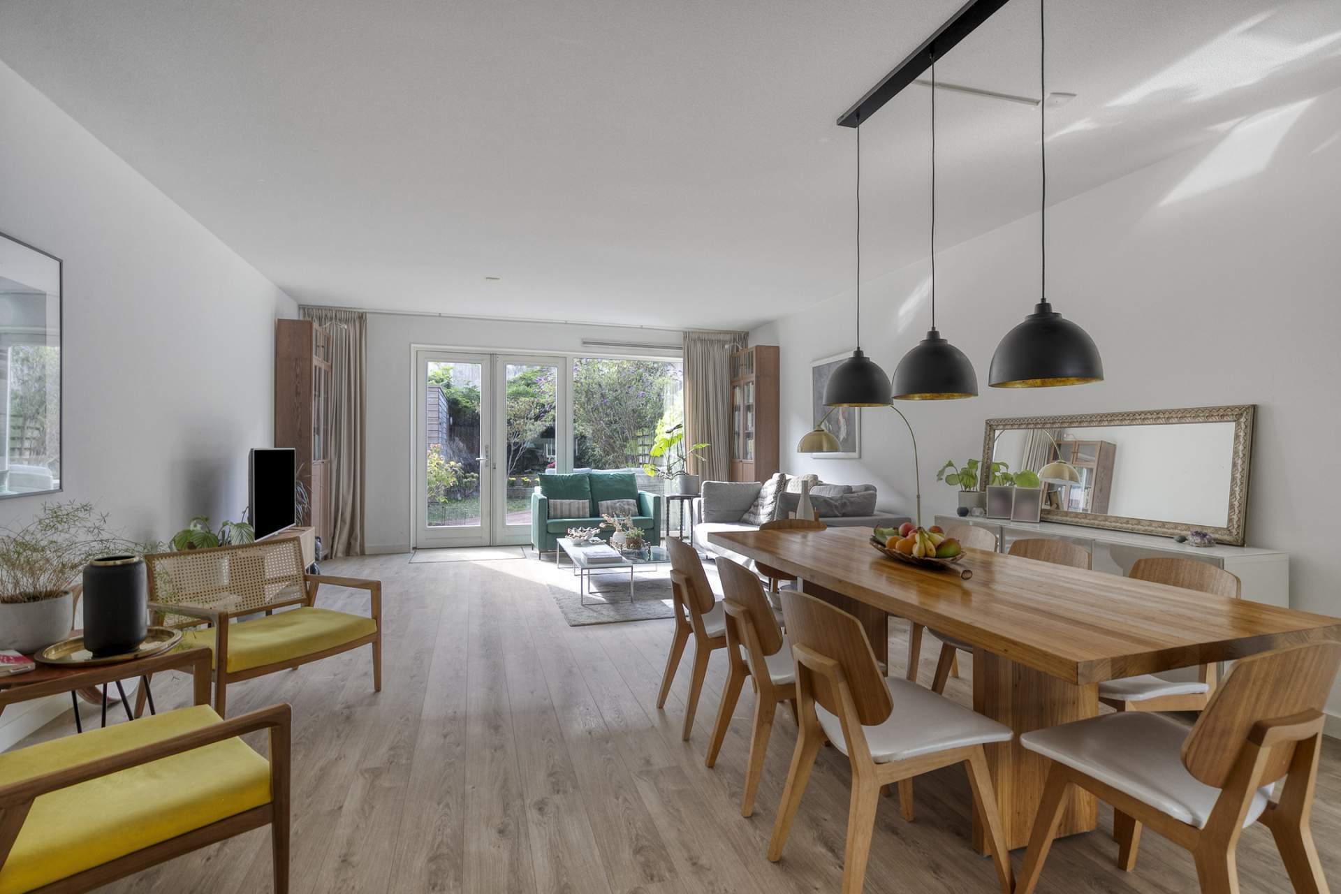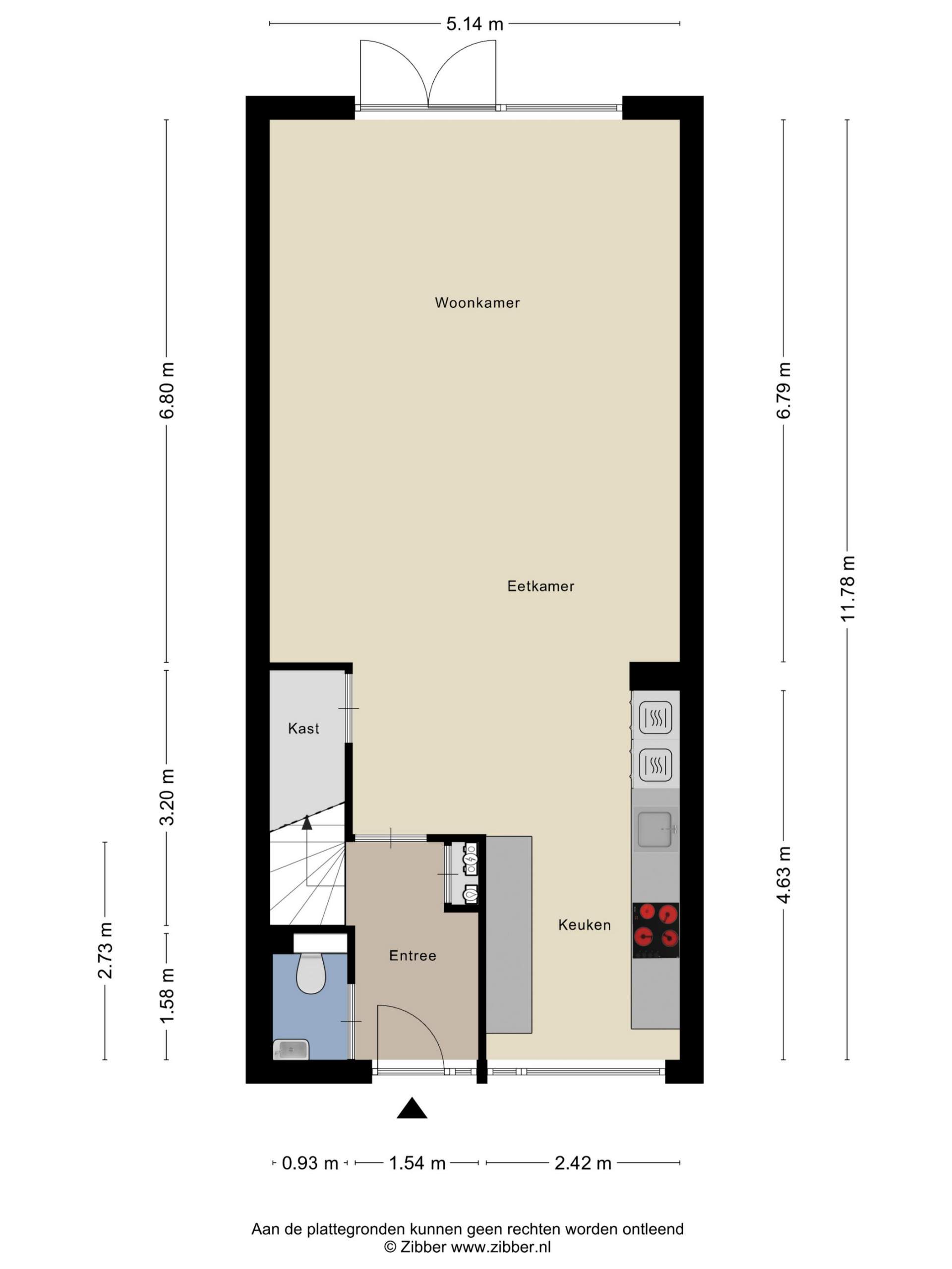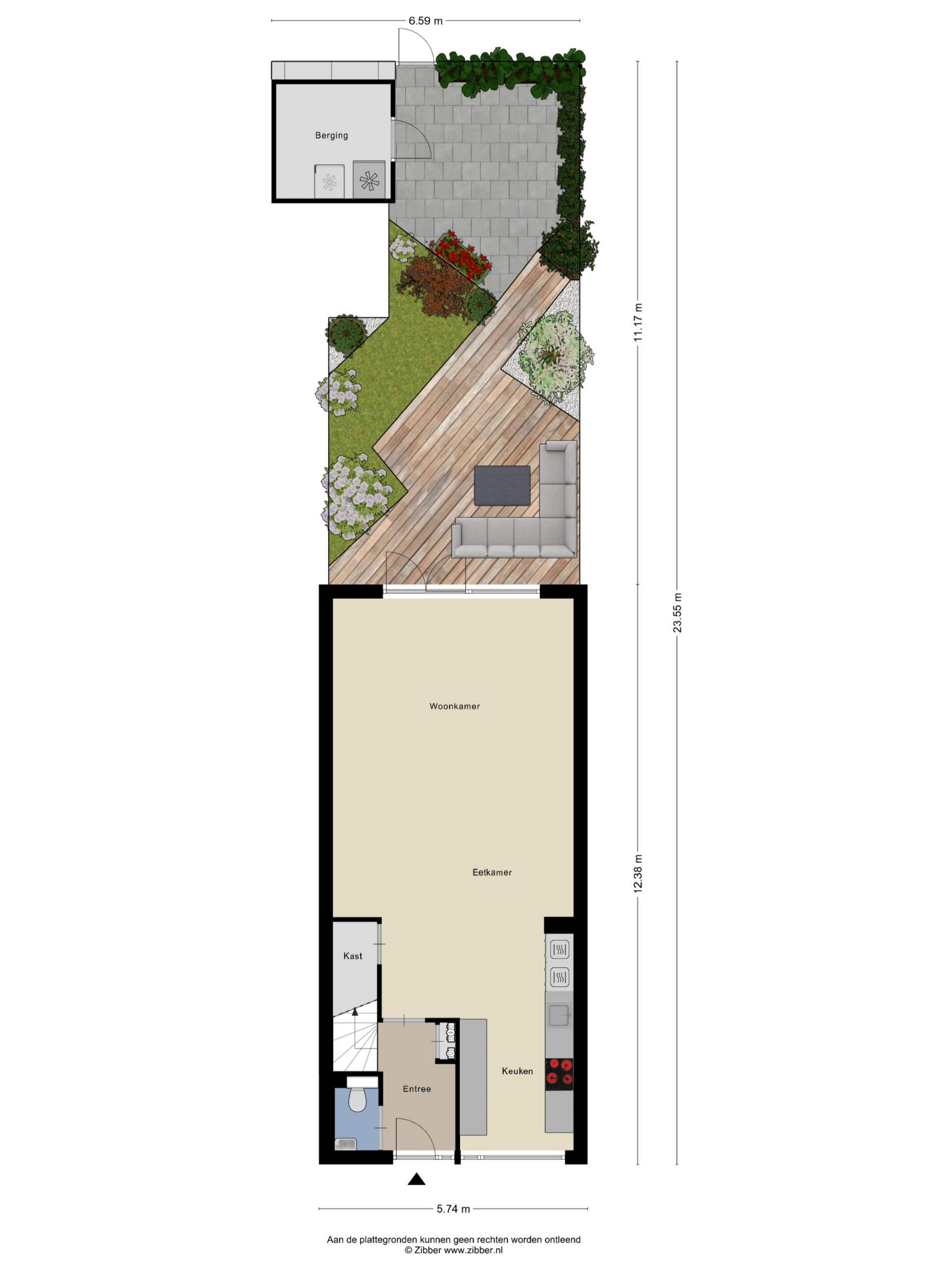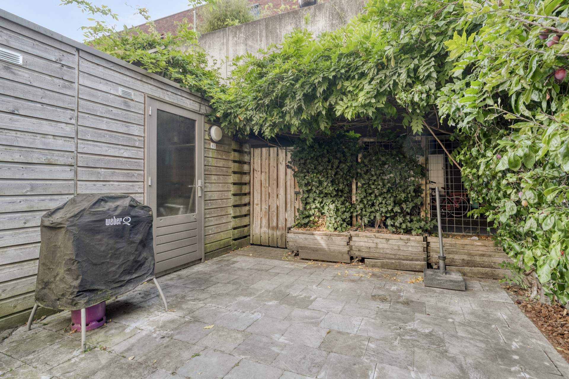 Entrance hall with a toilet, meter cupboard, and stairs to the upper floor. The living room features a spacious open-plan kitchen with all appliances and ample storage space. The living room itself has laminate flooring and French doors leading to the west-facing and beautifully landscaped garden. At the rear of the house is a shed for bicycles and garden tools. The garden is accessible via the shared garden at the rear.