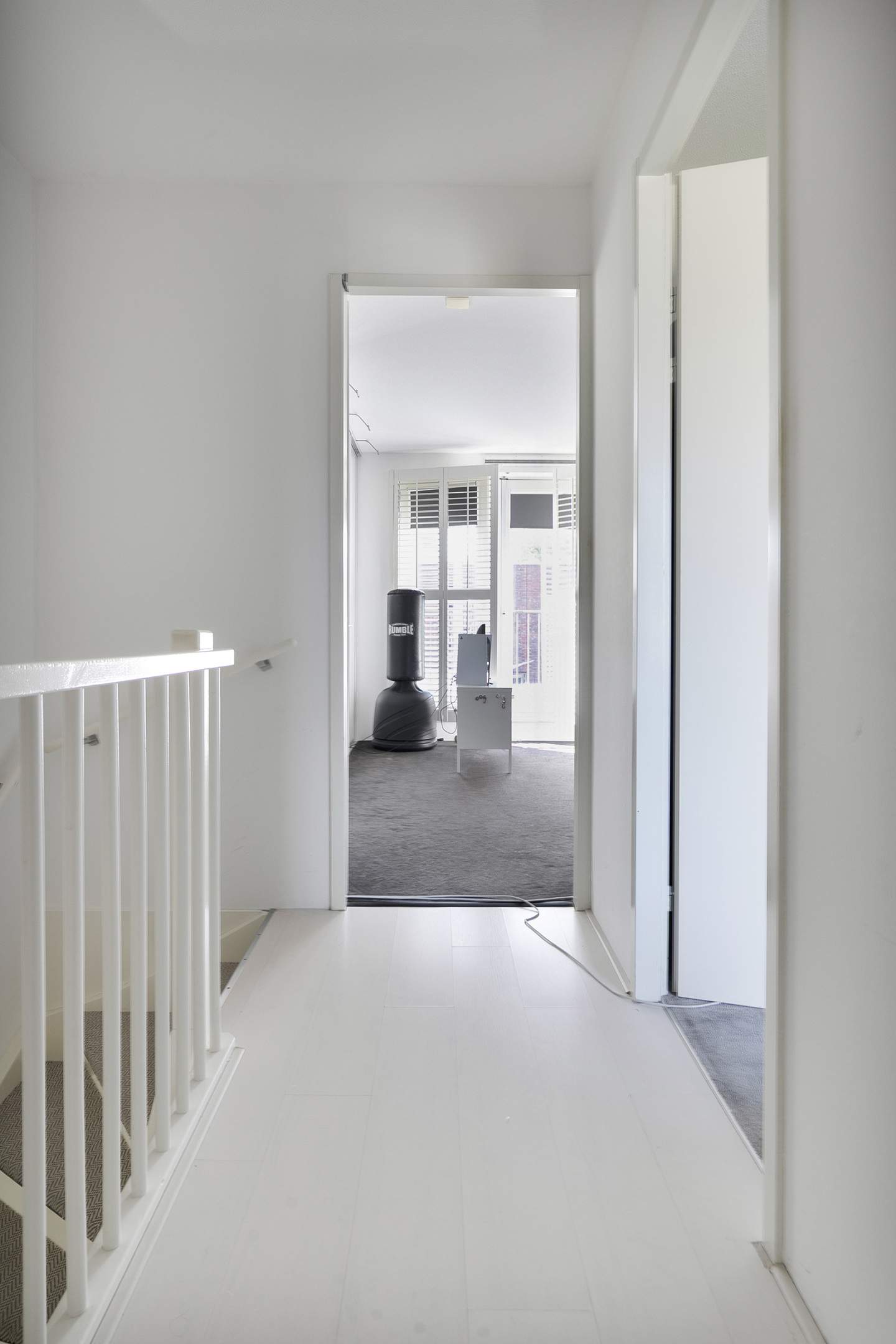Overloop met bergruimte en toegang tot wederom twee slaapkamers. Ook hier zijn openslaande deuren met Frans balkon. De verdieping heeft mooie op maat gemaakte kasten en onder de vloerbedekking is een laminaatvloer aanwezig.