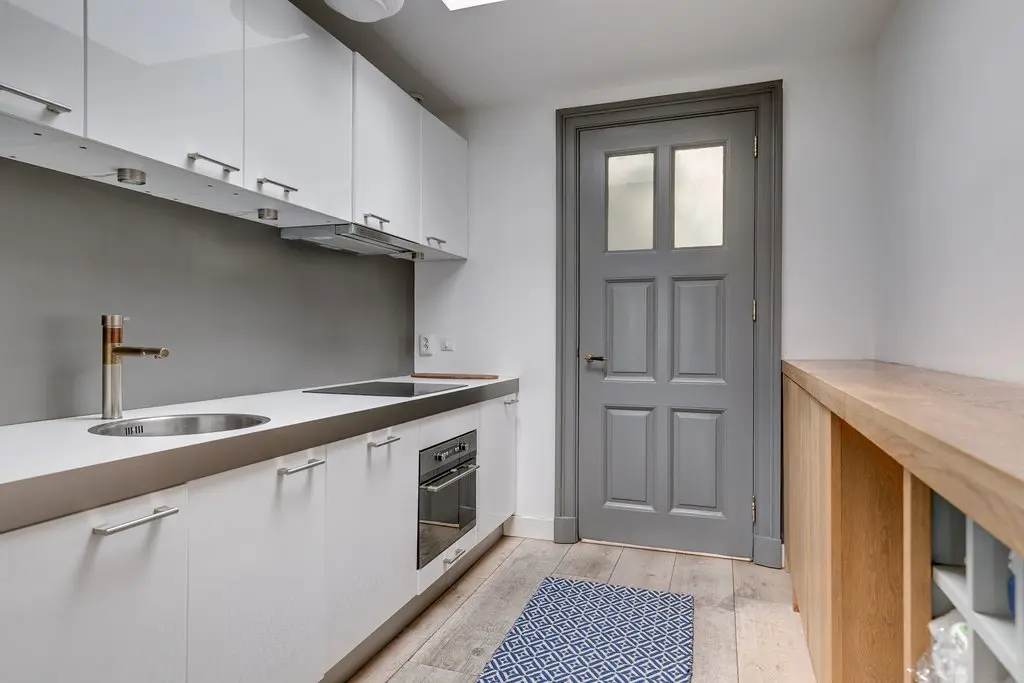 Entrance into the hall. The spacious living room gives a nice view of the inner gardens of the Nieuwegracht. Throughout the house lies a light oak floor with 28 cm wide boards. There is a very spacious bedroom with a double bed and wardrobe and beautiful outlook over the garden. Same applies for the second bedroom, which is also equipped with a double bed and a wardrobe. The semi open kitchen is a stylish and comes with a fridge with freezer, dishwasher, oven, extractor hood and an induction hob. The washing machine and dryer are located in the utility room. The bathroom has a shower, toilet and a double sink.