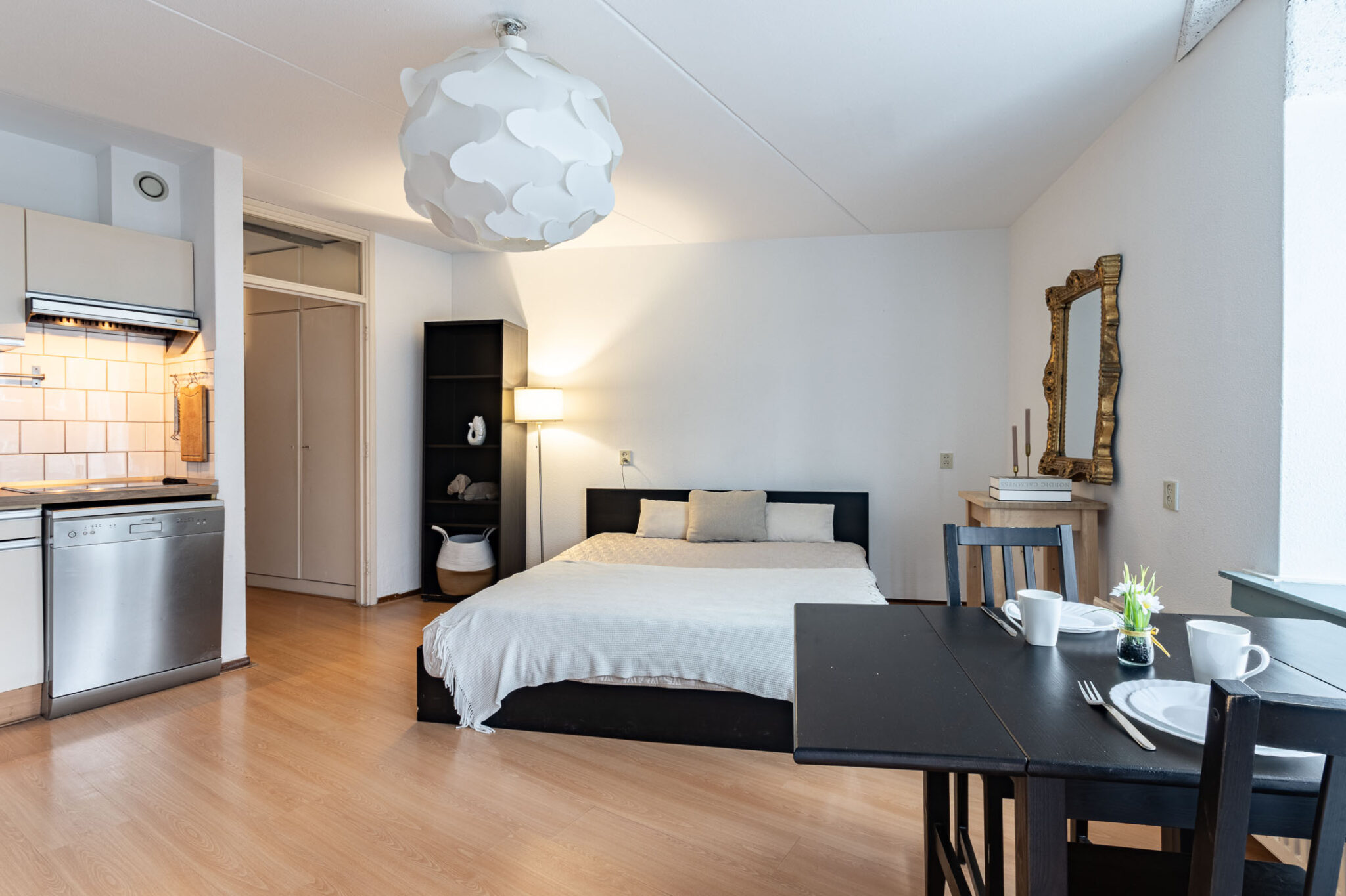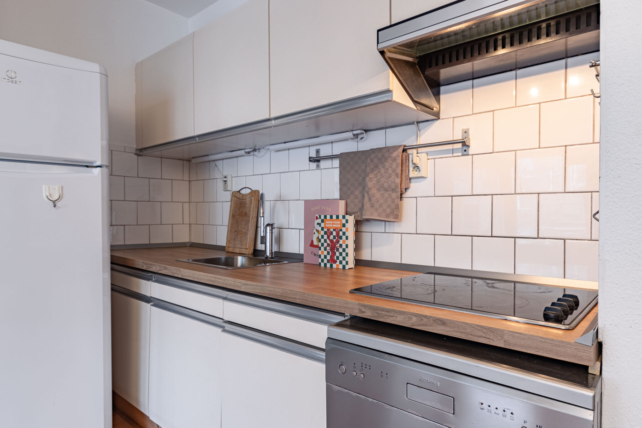De lichte woon-/slaapruimte beschikt over een open keuken en directe toegang tot het balkon op het Noord-Westen. De keuken is voorzien van een losstaande koel-/vriescombinatie, elektrische kookplaat, afzuigkap en losse vaatwasser.