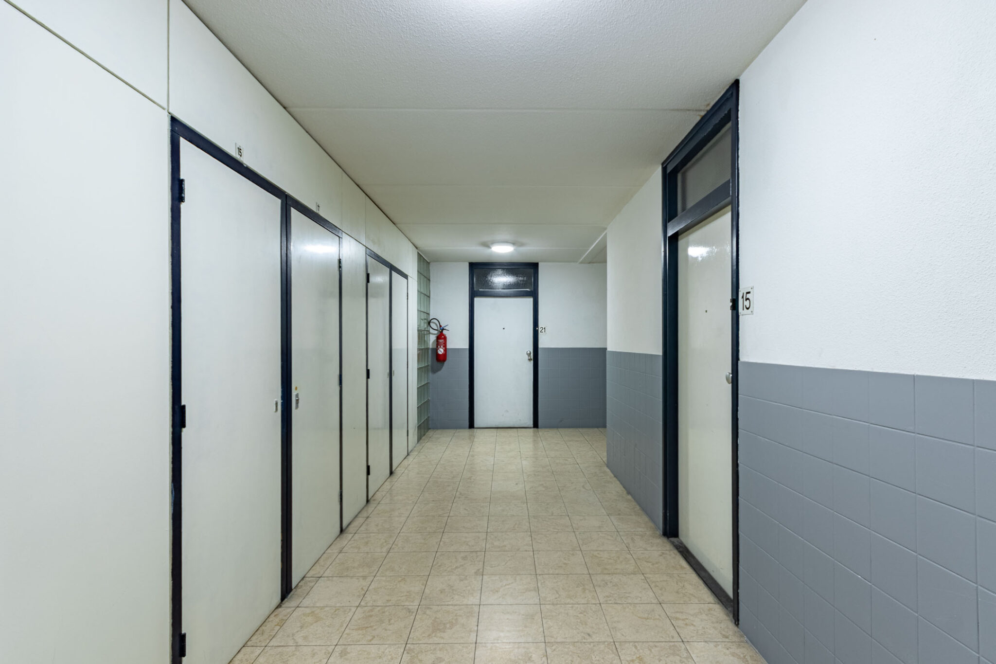 Afgesloten centrale entree met bellentableau en brievenbussen. Vanuit de centrale hal kom je met een aantal treden beneden bij de fietsberging en een fijne bergingskast. Een aantal treden omhoog brengt je naar het niveau van de lift en het afgesloten trappenhuis.