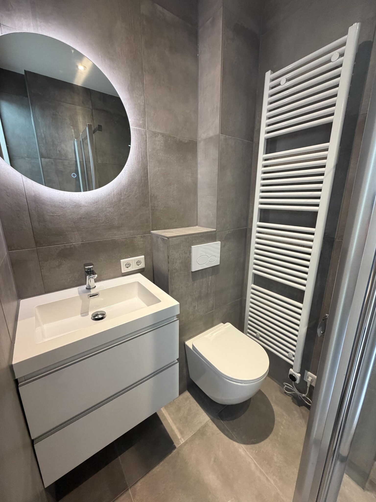 De moderne badkamer is compleet uitgevoerd met een douche, tweede toilet en een wastafelmeubel, verwarmde spiegel en een 2e zwevend toilet.